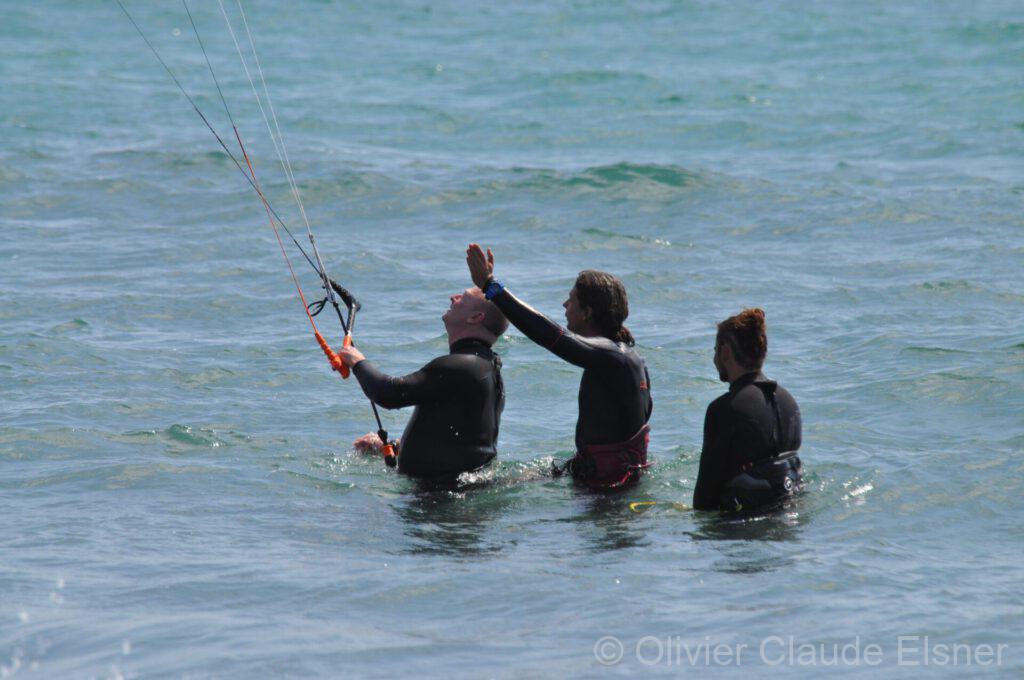 Alles was an Land relativ leicht war ist im Wasser etwas schwieriger. Ich war also gleich mit zwei Trainern im Wasser, Dominik und Mike. Nicht weil ich so schwer bin oder der Kite zu groß ist. Auch Kitetrainer müssen ständig geschult werden und Mike ist noch nicht so lange als Trainer tätig.