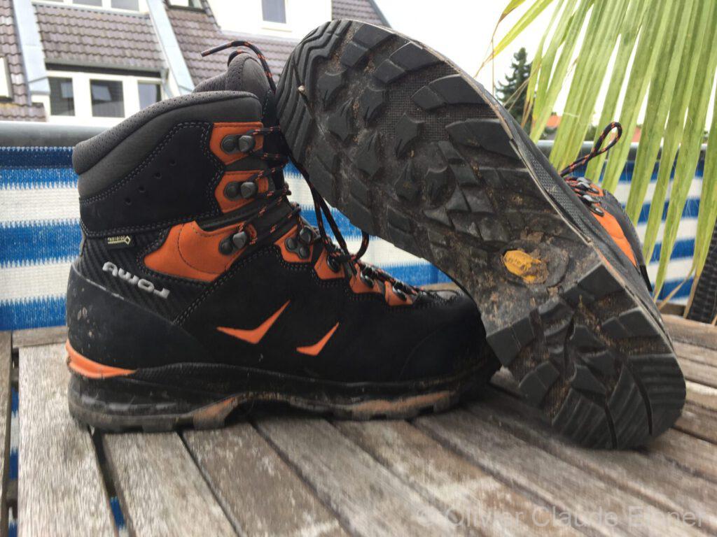Als allererstes zur Vibramsohle. Ich hatte niemals das Gefühl keinen guten Kontakt zum Boden zu haben. Ich bin niemals gerutscht und hatte immer den richtigen Vortrieb. Die Sohle hat sich unter allen Bedingungen im Untergrund festgebissen und nicht mehr losgelassen. Es haben sich nur zwei kleine Steinchen in der Sohle verirrt. Das stört aber nicht. Der selbstreinigende Aufbau der Sohle funktioniert sehr gut. Ob die Sohle 1200 km Kilometer durchhält weiß ich nicht. Das wäre aber meine Erwartung. Mir wurde mitgeteilt, dass diese Strecke für die Sohle kein Problem sei. Außerdem kann die Sohle ausgetauscht werden. Das ist ein Plus.